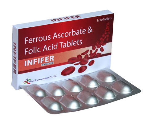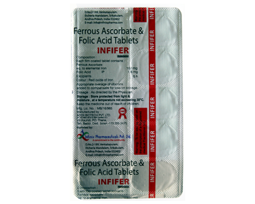 INFIFER is used for the treatment and prevention of iron and Vitamin B9 deficiency. It also helps in maintaining the proper supply of oxygen throughout the body by aiding the production of red blood cells (RBCs) which are known to play a key role in oxygen supply. It is also used for treating iron-deficiency anemia which can occur due to chronic blood loss or inadequate intake of iron. It is also recommended to fulfill the iron requirement of the body and prevent anemia during pregnancy and lactation. INFIFER is also it is used in postpartum care, nutritional anemia, chronic or acute blood loss during menstruation. It contains iron (in the form of ferrous ascorbate) and folic acid (Vitamin B9) as the main ingredients. Vitamin B9 (Folic acid) is another water-soluble B-complex vitamin that is naturally available in food as folate and folic acid. This vitamin acts as a coenzyme in the synthesis of nucleic acid (DNA) and red blood cells. It is responsible for oxygen supply and also overall growth and development.As this tablet contains iron in the form of ferrous ascorbate, it helps in quick absorption of Folic acid is essential to numerous bodily functions in both children and adults as it is required to produce healthy red blood cells and prevent anemia. This tablet is generally safe and has little or no side effects. However, in case you are taking any other medications or diet supplements, it is best to inform your doctor to avoid drug interaction.