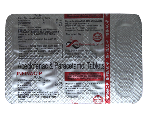 INFINAC-P Tablet is used to reduce pain and inflammation in conditions like arthritis, Low Back Pain, ankylosing spondylitis, Inflammatory conditions of ear nose throat, Acute arthritic flare, osteoarthritis muscle pain and dental pain. INFINAC-P Tablet should take regularly as advised by your doctor and it should be taken food to prevent stomach upset. Do not take more or use it for a longer duration than recommended by your doctor. Doctor may change the dose and time between doses according to your level of pain. Some of the common side effects of this medicine include nausea, vomiting, stomach pain, loss of appetite, heartburn, and diarrhea. If any of these side effects bother you or do not go away with time, you should let your doctor know. Your doctor may help you with ways to reduce or prevent these side effects by prescribing an alternative medicine or adjusting the dose. The medicine may not be suitable for everybody. Before taking it, let your doctor know if you have any problems with your heart, kidneys, liver, or have stomach ulcers. To make sure it is safe for you, let your doctor know about all the other medicines you are taking. Pregnant and breastfeeding mothers should first consult their doctors before using this medicine.