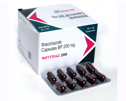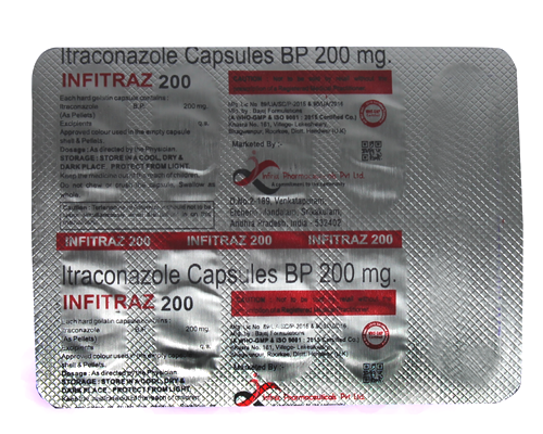 INFITRAZ 200 Capsule belongs to a group of medicines called antifungals. It works by stopping the growth of fungi and is used to treat the conditions like vaginal candidiasis, vulvovaginitis, Onychomycosis, Oral thrush, dermatophytosis, systemic fungal infections, mucocutaneous candidiasis. It kills fungi by destroying the fungal cell membrane. INFITRAZ 200 Capsule should be taken in the dose and duration as prescribed by your doctor. Do not take it if you are pregnant or could become pregnant unless your doctor has told you to. Talk to your doctor before taking this medicine if you have ever had heart failure, a weak immune system (including HIV/AIDS), kidney problems, or liver problems such as yellow skin (jaundice). This medicine may not be suitable for you. If your course of treatment is for more than a month, your doctor may want to check your liver by testing your blood.